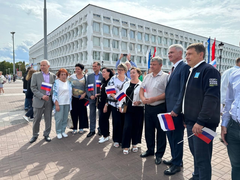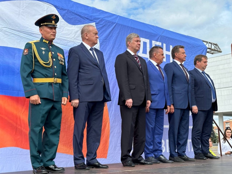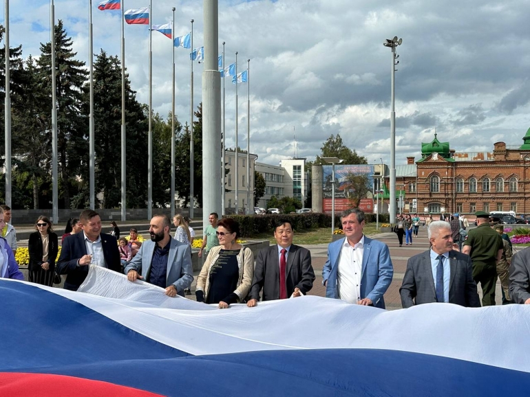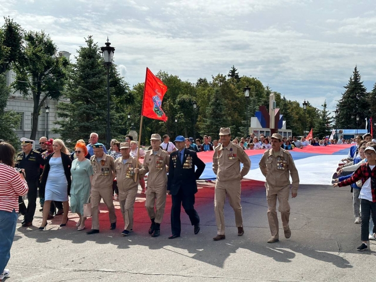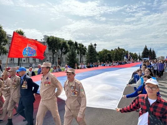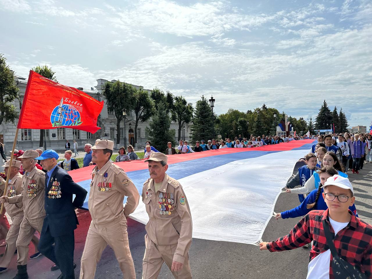 Центральной площадкой празднования стала площадь Ленина, где собрались первые лица города и области, члены семей участников СВО, почетные граждане, представители молодежных и ветеранских организаций. Волонтеры и политики пронесли флаг России длиной 50 метров от Соборной площади до мемориала.
