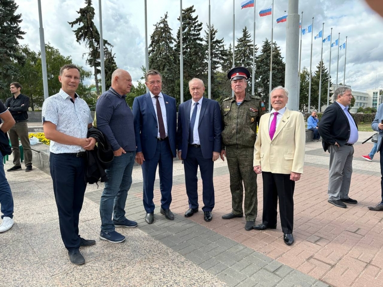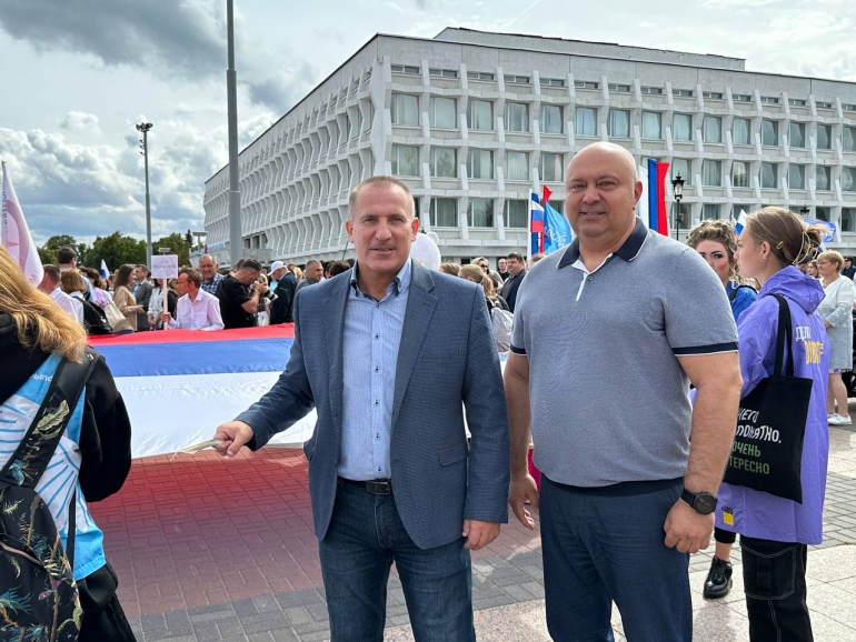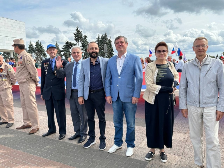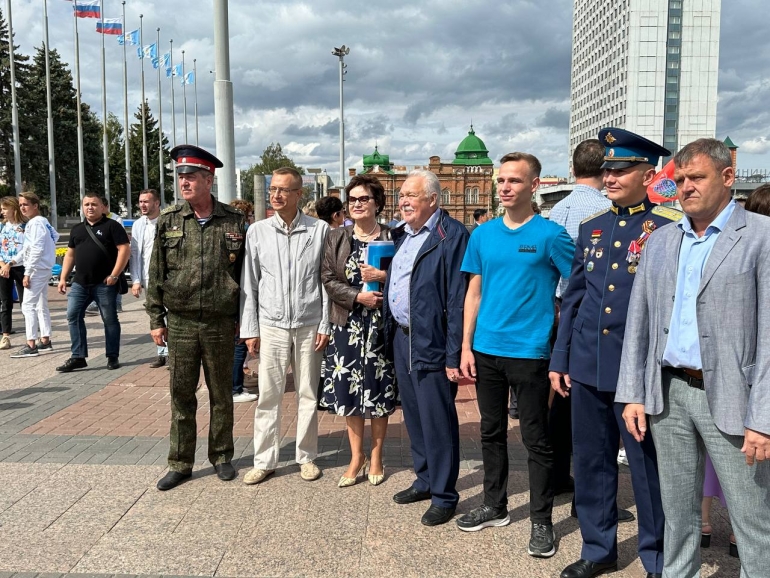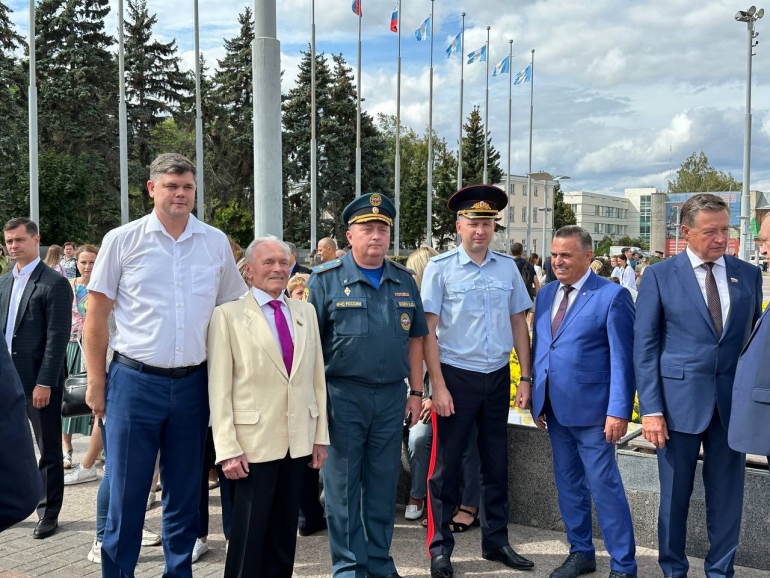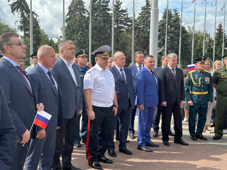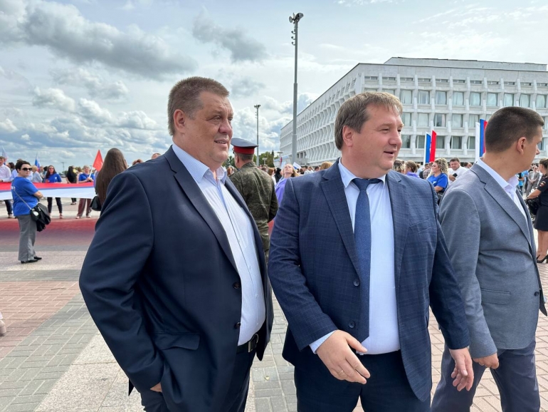 Центральной площадкой празднования стала площадь Ленина, где собрались первые лица города и области, члены семей участников СВО, почетные граждане, представители молодежных и ветеранских организаций. Волонтеры и политики пронесли флаг России длиной 50 метров от Соборной площади до мемориала.