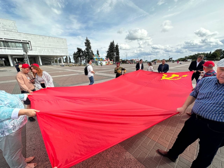 КПРФ отличились - развернули свой алый флаг с изображением серпа и молота. Коммунисты принесли с собой большое полотнище Союза Советских Социалистических Республик, руководил процессом депутат ЗСО Виталий Кузин.