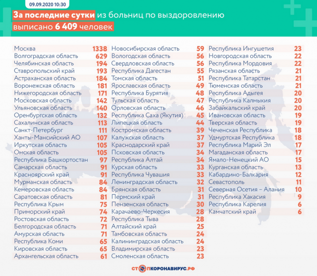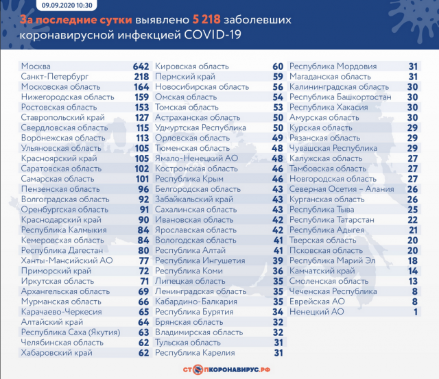 За последние сутки в России выявлено 5 218 заболевших в 83 регионах, выписано по выздоровлению 6 409 человек, подтверждено 142 летальных случая с коронавирусом.