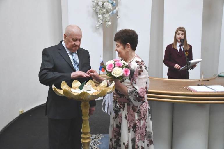 В городском Дворце бракосочетаний состоялась необычная церемония – «молодожены» Лидия и Николай Князькины отметили изумрудную свадьбу.
