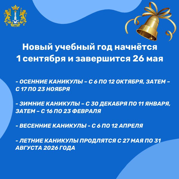 Летние каникулы продлятся с 27 мая по 31 августа 2026 года.