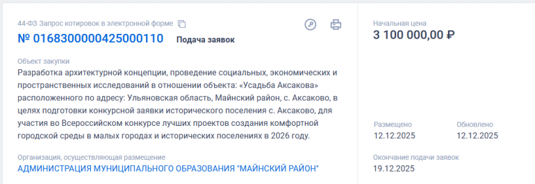 На сайте ЕИС «Закупки» объявили о подаче заявок на участие в электронных торгах на разработку архитектурной концепции, также проведение социальных, экономических и пространственных исследований для усадьбы Аксакова, располагающейся в одноименном селе Майнского района.