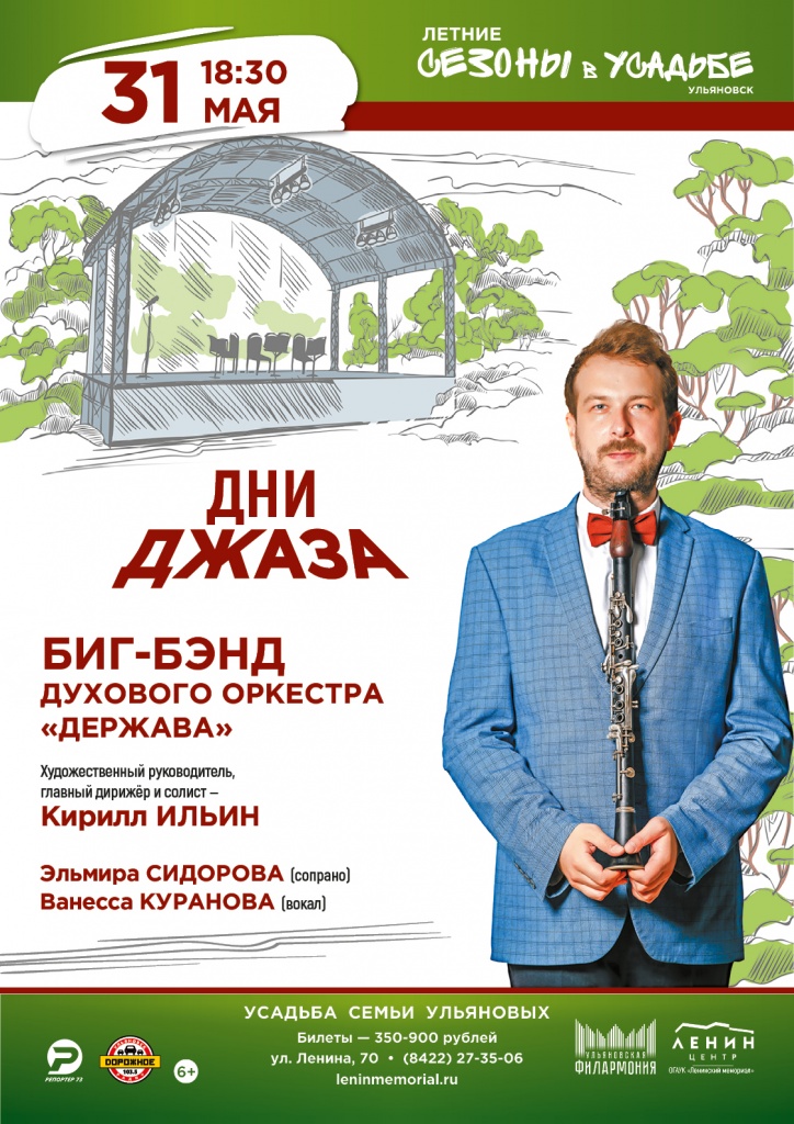 31 мая в 18:30 в рамках «Летних сезонов в усадьбе» (Ленина, 70) будет программа Биг-бэнда «Держава» — от музыки королей свинга Бени Гудмана и Вуди Германа до композиций Чика Кориа. Кроме того, Биг-бэнд исполняет и популярные классические мелодии в джаз- и рок-аранжировках. Безупречный музыкальный вкус, виртуозность исполнителей, великолепные аранжировки не оставят равнодушными даже самых искушенных меломанов. Все аранжировки программы, как истинный бэнд-лидер, создал Кирилл Ильин.