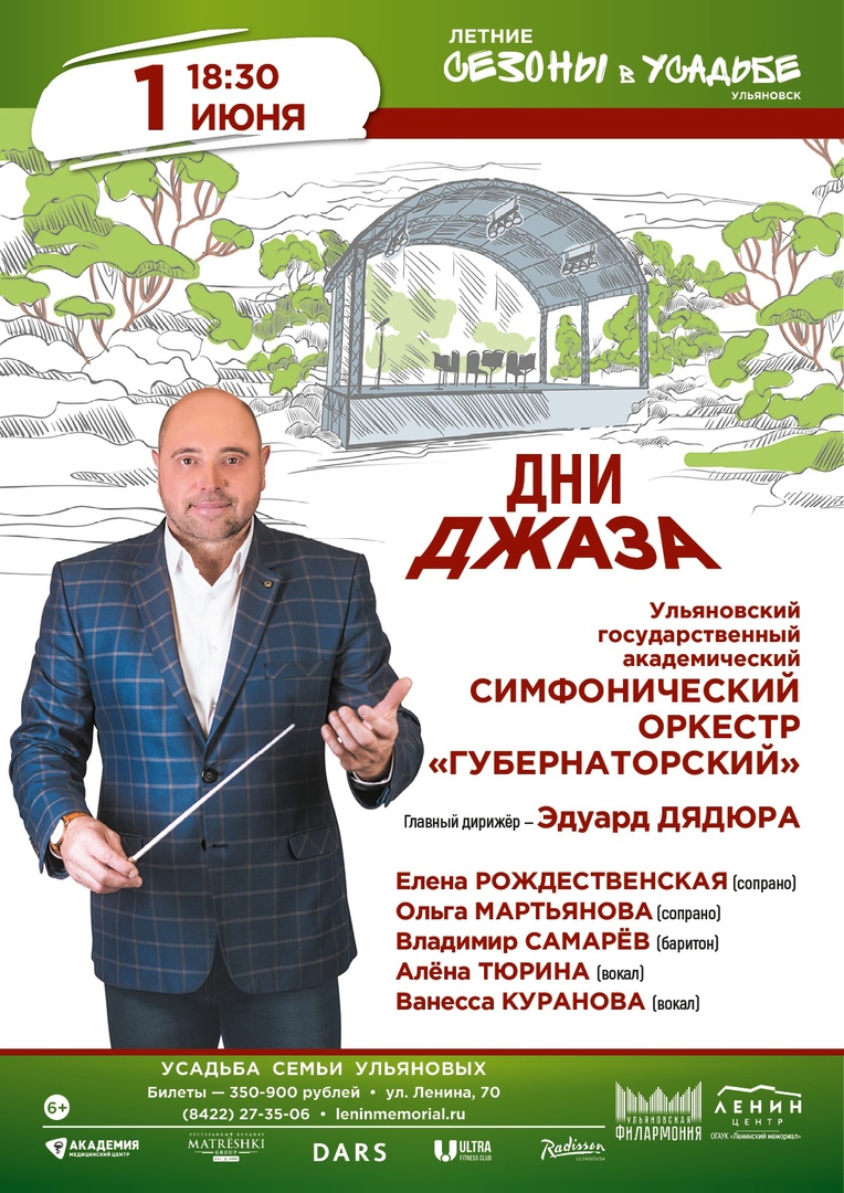 1 июня в 18:30 в Дни джаза выступает симфонический оркестр «Губернаторский». Главный дирижёр — Эдуард Дядюра, Елена Рождественская (сопрано), Ольга Мартьянова (сопрано), Владимир Самарёв (баритон), Алёна Тюрина (вокал), Ванесса Куранова (вокал). Украшением программы первого летнего вечера станут и песни, которые в своё время исполняли легенды мировой музыки и джаза. Среди них Фрэнк Синатра, Луи Армстронг, Нат Кинг Коул, Майкл Бубле и Элла Фицджеральд. Это «Moon River» из кинофильма «Завтрак у Тиффани» Генри Манчини, испанская лирика «Quizas, quizas, quizas» Освальдо Фарреса, «Будь моей любовью» Николаса Бродского, «CryMeaRiver» Артура Гамильтона, «Puttin’ ontheRitz» Ирвинга Берлина