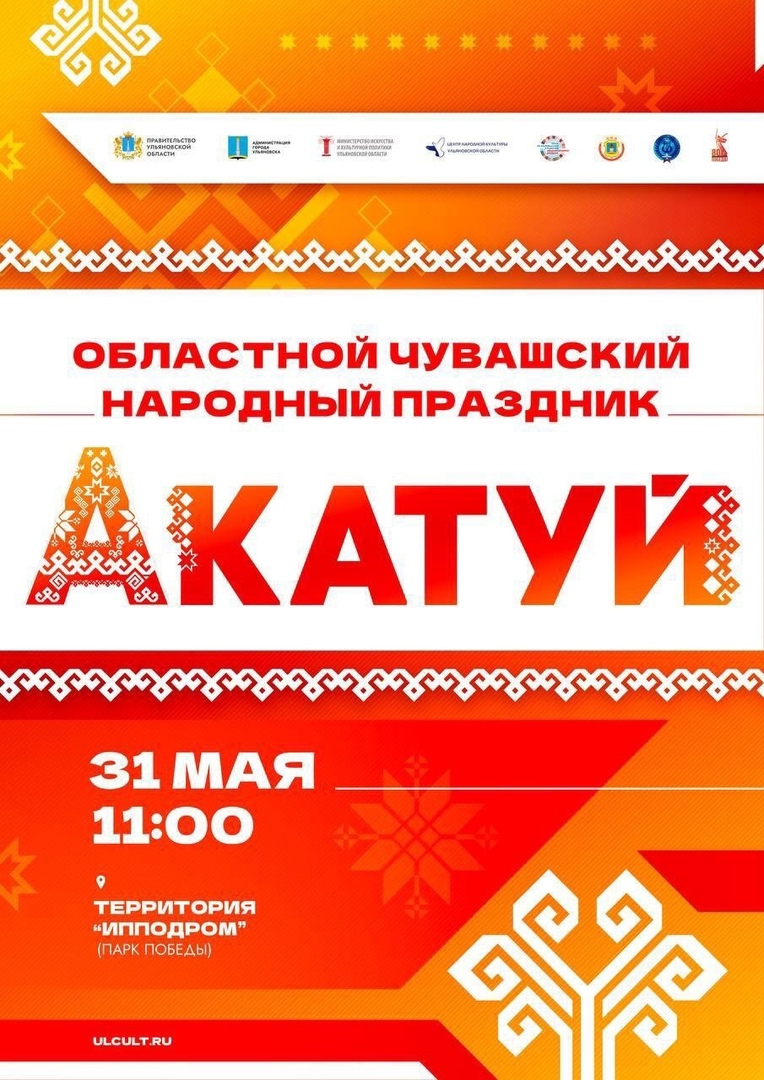 31 мая в 11:00 в парке Победы отметят национальный чувашский праздник. В программе: выставки национальных ремесел и декоративного прикладного искусства, работа детской площадки, площадка «Открытый микрофон», спортивная национальная борьба «Кĕрешÿ», концерт творческих ульяновских коллективов, выступление профессиональных коллективов и солистов Государственного ансамбля песни и танца Чувашской республики, чувашская эстрадная группа «ASАМАТ», ансамбль чувашской песни «Салам» (г. Чебоксары), выставка-конкурс национальных чувашских подворий.