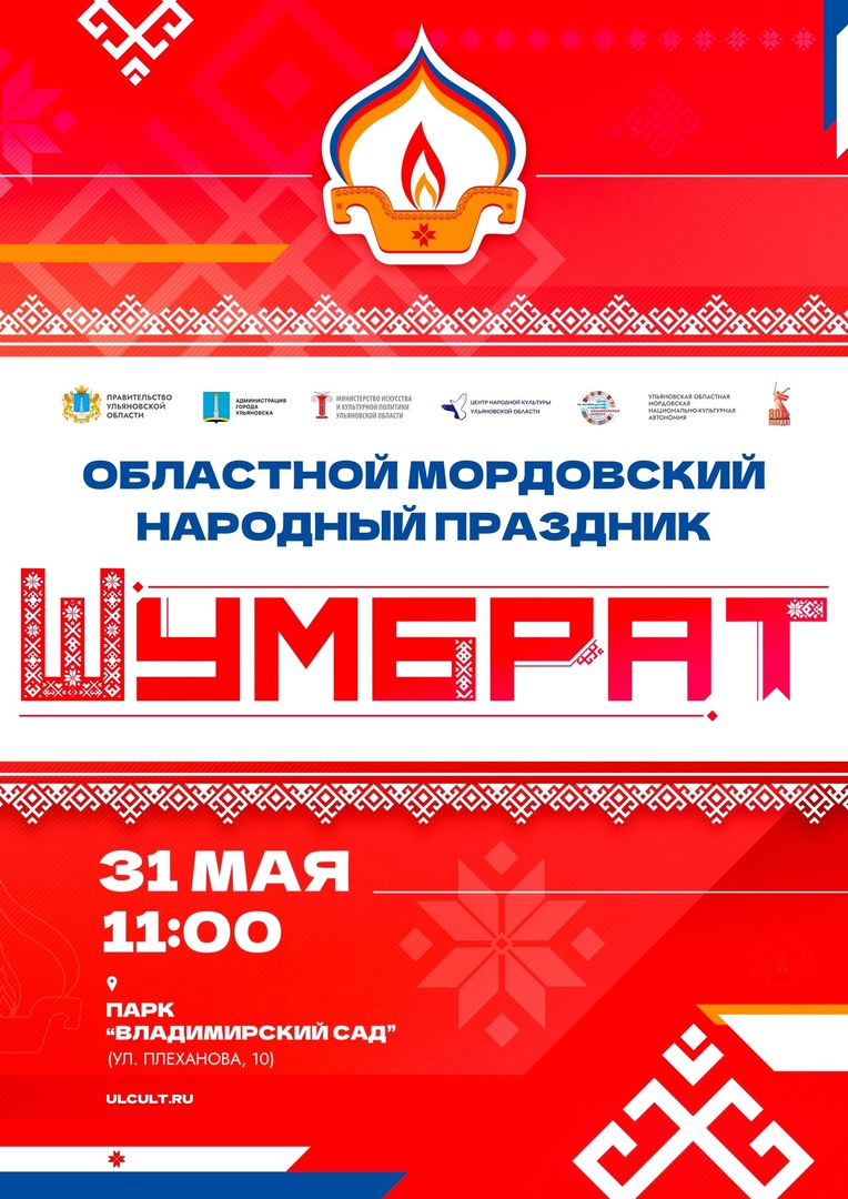31 мая в 11:00 в парке «Владимирский сад» начнется мордовский народный праздник Шумбрат. В программе: выступление артистов из Мордовии — Государственного ансамбля песни и танца «ВАРМА», этновыставки декоративно-прикладного творчества мордовского народа, выступление мордовских творческих коллективов из разных районов Ульяновской области, выставка национальных мордовских подворий, пленэр юных художников, соревнования по национальной борьбе «Тюште».
