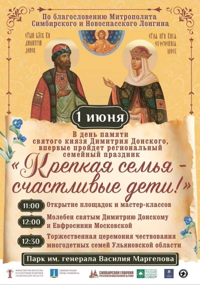 С 11:00 в парке недалеко от строящегося храма во имя святого благоверного великого князя Димитрия Донского будут работать площадки от клуба начальной военной подготовки «Рокот» и Русской общины, пройдут мастер-классы по колокольному звону и плетению венков. Показательные выступления подготовят участники епархиального спортивного клуба «Муромец», Ульяновская областная федерация самбо и Симбирское казачество. В 12:00 Митрополит Симбирский и Новоспасский Лонгин совершит молебен святым Димитрию Донскому и Евфросинии Московской. В 12:30 пройдут торжественная церемония чествования многодетных семей Ульяновской области и праздничный концерт.