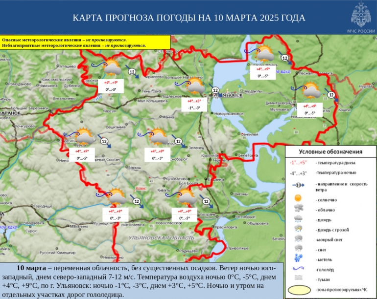 Температура воздуха ночью 0°С, -5°С, днем +4°С, +9°С, по Ульяновску: ночью -1°С, -3°С, днем +3°С, +5°С. Ночью и утром на отдельных участках дорог гололедица.