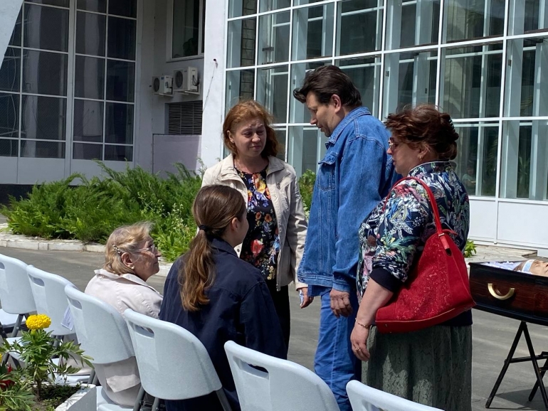 Ректор УлГПУ Игорь Петрищев долго стоял у гроба, потом сел рядом с мамой Алексея Юрьевича, обнял ее и выразил слова поддержки.