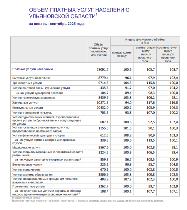 Ульяновскстат опубликовал очередной отчет об объемах платных услуг населению. С января по сентябрь жители региона потратили более 78 млрд рублей на оплату услуг, что на 3,7% больше, чем за аналогичный период прошлого года.