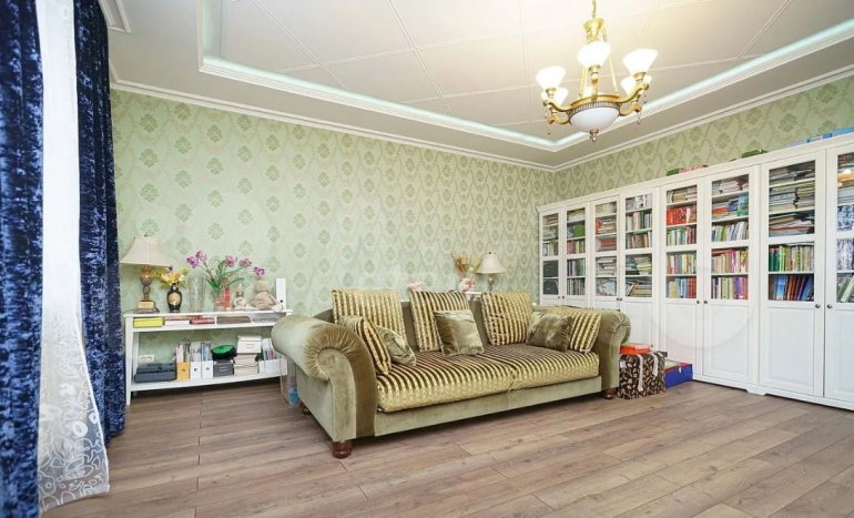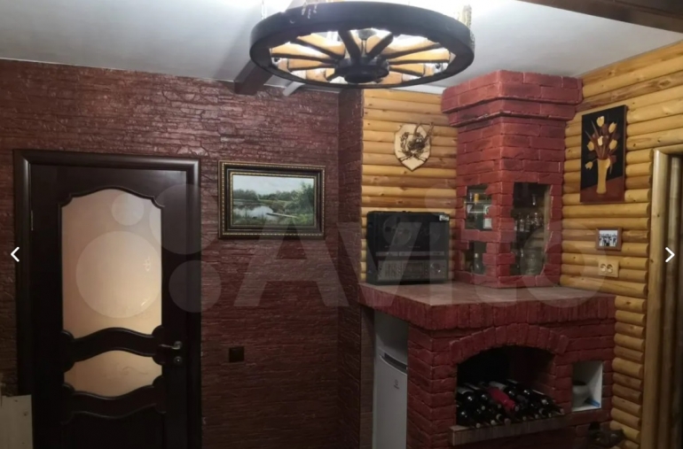 Квартира площадью 285 кв. м в таунхаусе преподносится как совмещение преимуществ частного дома и жизни в городе. Покупателей удивляют сауной прямо в квартире, собственным зимним садом и небольшим участком в придачу. На одном из фото виден оригинальный дизайн – лепнина, имитирующая ветку дерева, на потолке и имитация русской печи, в которую встроили холодильник и полки для бутылок вина.