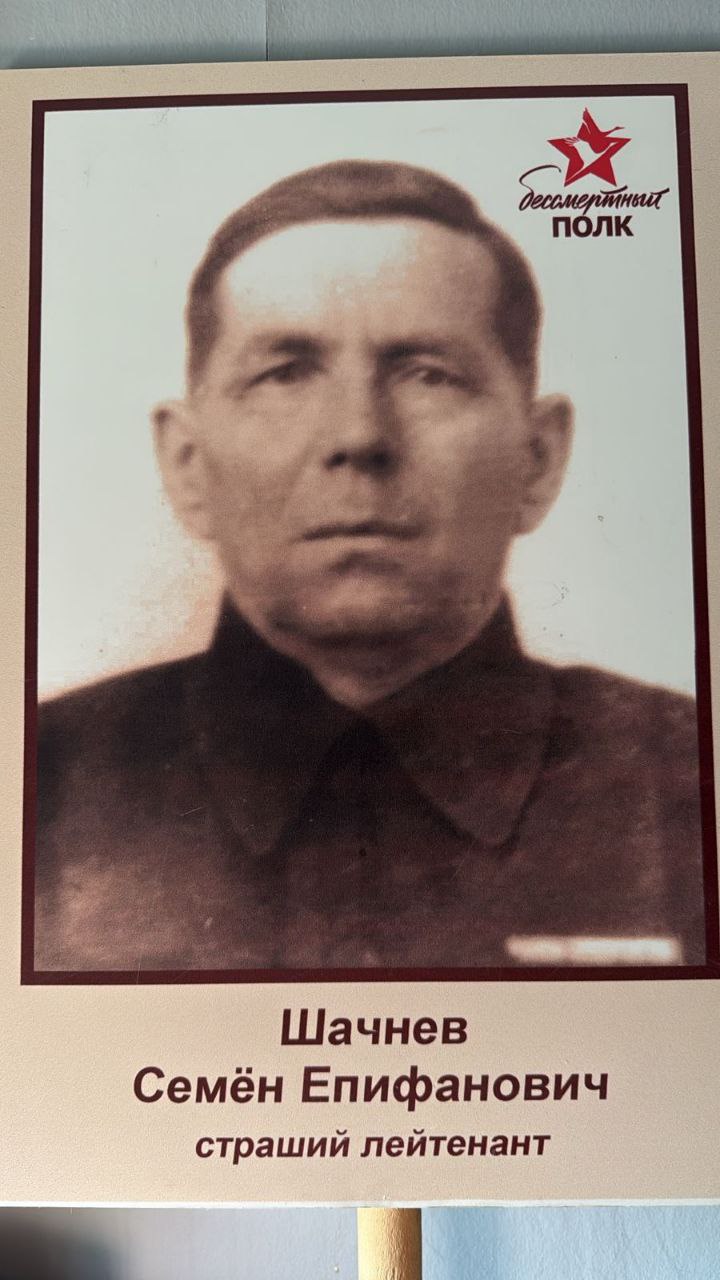 — Деда по матери, Шачнева Семёна Епифановича, призывали из Новоаннинского (ныне — город в Волгоградской области), ему тогда было чуть больше 20 лет. Воевал на нескольких фронтах, дошёл до Кёнигсберга. Также освобождал Беларусь, был ранен, когда бойцы попали в окружение. Награжден орденами и медалями. После войны работал в администрации родного города. Я его не застал, он умер, когда мне был год. По словам родственников, не любил рассказывать про военные действия. Говорил, что война — большое горе.