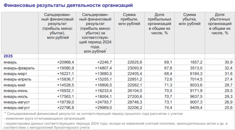 Согласно данным, в январе-сентябре текущего года по оперативным данным сложился положительный сальдированный финансовый результат (прибыль минус убыток) крупных и средних предприятий и организаций (без учета малого бизнеса, организаций бюджетной сферы — государственных и муниципальных, а также финансово-кредитных структур и страховых обществ) в сумме 22796,8 млн рублей.