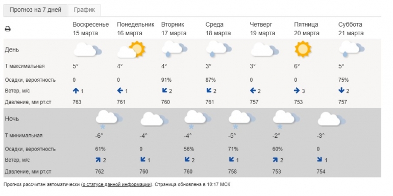 Прояснение ожидается в понедельник, 16 марта, а также солнечная погода — 20 марта. По ночам температура воздуха не опустится ниже -6 градусов по Цельсию, а днем не полнимется выше +6. На неделе возможен снег по ночам и небольшой дождь в дневное время.