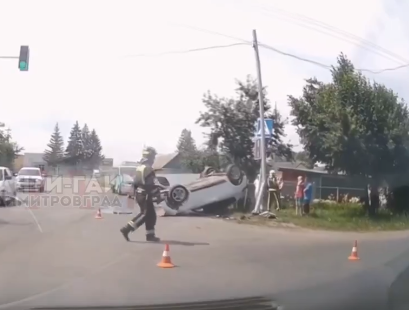 От удара автомобиль «Рено» влетел в светофор и опрокинулся.