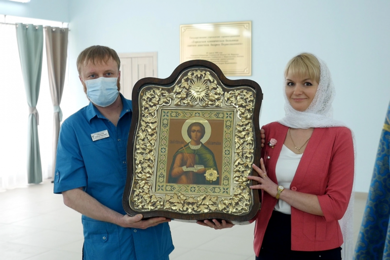 Владыка совершил молебен и обратился к присутствующим с приветственным словом. Управляющий епархией передал в дар больнице икону святого целителя Пантелеимона.