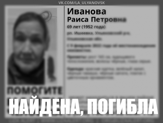 Портал 73онлайн писал, что в поселке Ишеевка Ульяновского района 9 февраля во второй раз пропала 69-летняя местная жительница, которая плохо ориентируется в пространстве. Как стало известно, её нашли мёртвой.