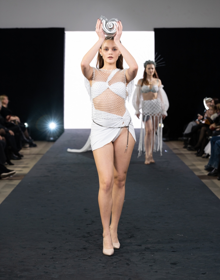 Одна из коллекций была выполнена в белом цвете. Девушка несла артефакт в форме раковины аммонитов.