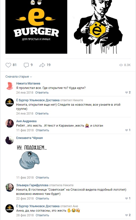 Ульяновская айдентика ё-бургеров взбудоражила город в 2018 году. Слоган «Для простых и умных», стилизованные изображения таких знаковых для города персон, как Карамзин, Гончаров, Пластов, Ленин, поедающих стритфуд, острые ответы подписчикам в соцсетях – владельцы «Ё-бургера» смело заявили о себе, а анонсирующий открытие пост собрал более 8 тысяч просмотров во «ВКонтакте». Весной заведение наконец распахнуло свои двери, предложив ульяновцам и бургеры, и вок-лапшу, и картошку фри – словом, полный набор фастфуда на любой вкус и цвет. Расположилось кафе неподалеку от «Белого дома», в гостинице «Советской» – место, с одной стороны, привлекательное отсутствием поблизости конкуренции, с другой – не такое популярное у местных гурманов, как та же улица Федерации. И вот спустя год и три месяца ё-бургеры выставили на Avito.