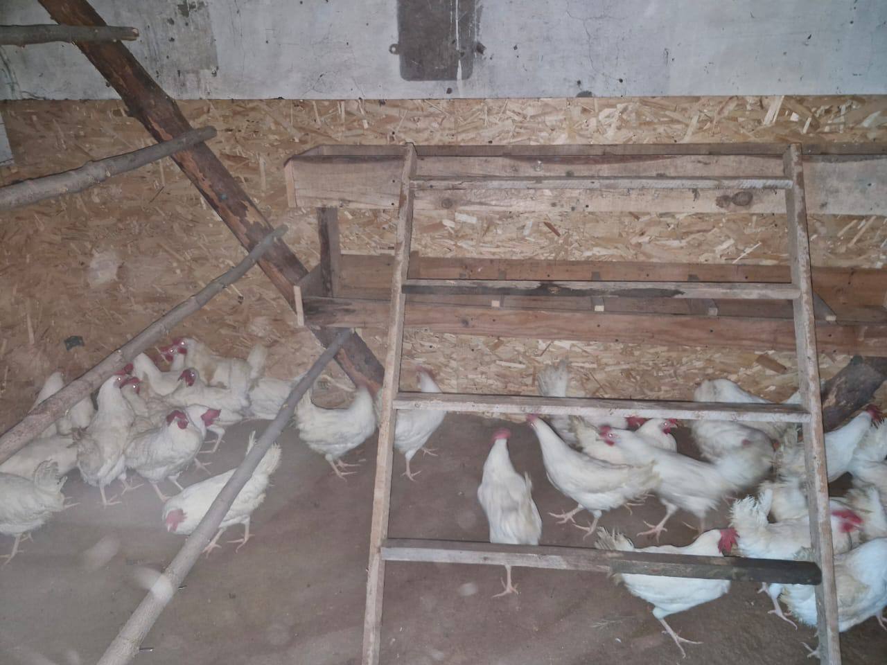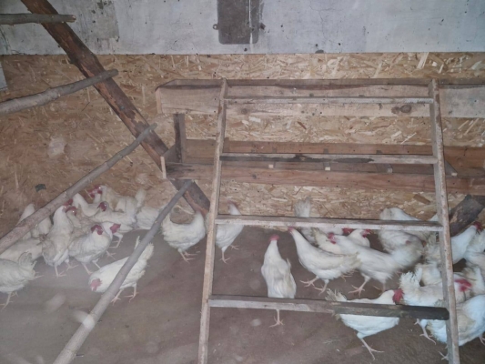 Куры (все белые, чистенькие, как на подбор) живут в прекрасных условиях – аккуратные кормушки, красные поилки, деревянные лестницы-насесты.
