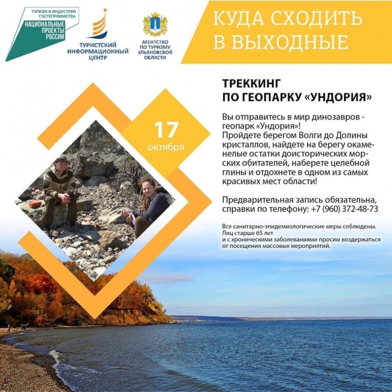 Вы отправитесь в мир динозавров — геопарк «Ундория»! Пройдете берегом Волги до Долины кристаллов, найдете на берегу окаменелые остатки доисторических морских обитателей, наберете целебной глины и отдохнете в одном из самых красивых мест области!