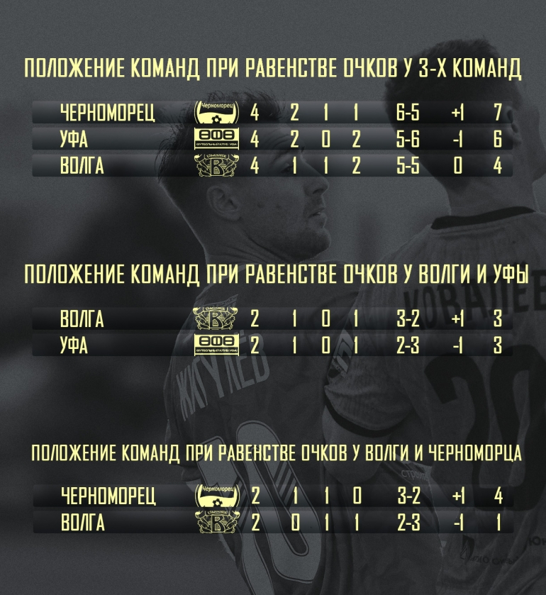 Самый опасный сценарий для ульяновцев — равенство очков у всех трех конкурентов. В этом случае «Волга» окажется худшей по результатам личных встреч: у волжан в активе всего четыре очка против семи у «моряков» и шести у уфимцев. Если же придется мериться силами только с «Черноморцем», преимущество снова будет на стороне южан из-за их победы в Новороссийске и ничьей в Ульяновске. Единственный, кого команда Михаила Белова может обойти при равенстве очков — это «Уфа». За счет домашней победы 2:0 и важного гола в гостевом матче ульяновцы имеют положительное сальдо в очных спорах с соседями.