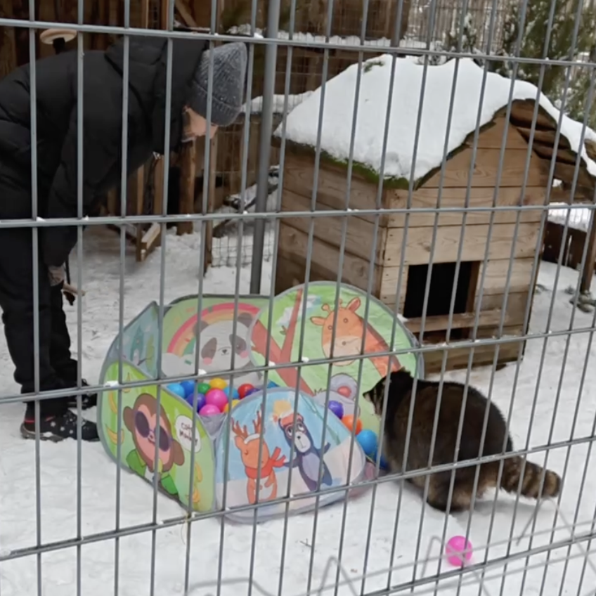 Енотам Клёпе и Феле из Ульяновского зоопарка доставили целый набор приспособлений для активного досуга. В вольере установили веревочные лестницы и канаты – для ловкости и скорости; кегли — для игры в «енотий» боулинг; сухой бассейн с шариками — для отдыха после игр;