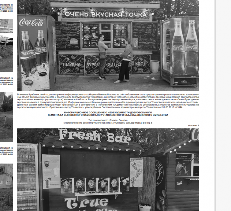В муниципальной газете «Ульяновск сегодня» — очередные объявления о сносе. На этот раз под раздачу попали почти все торговые павильоны на эспланаде и Новом Венце.