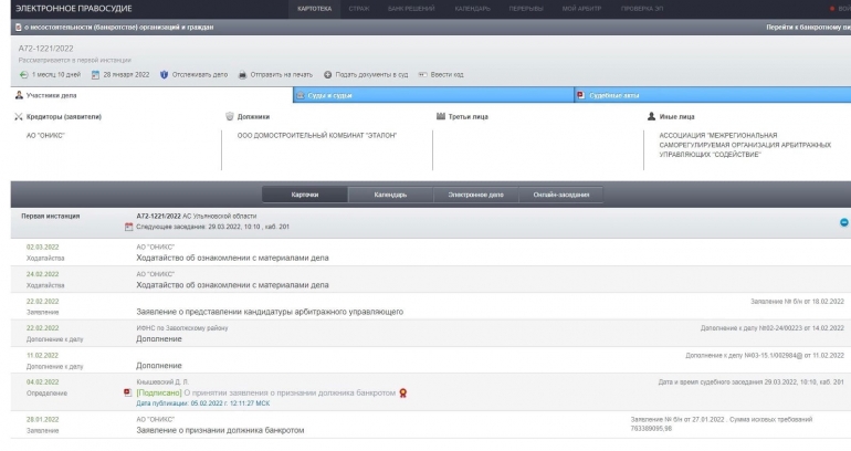 27 января 2022 года в Арбитражный суд Ульяновской области поступило исковое заявление от АО «Оникс» из города Киров (основной вид деятельности - производство изделий из бетона для использования в строительстве - прим.), который требует признать «Эталон» банкротом за долг в 763,3 млн рублей. В настоящее время идет ознакомление с материалами дела, судебное заседание назначено на 29 марта.