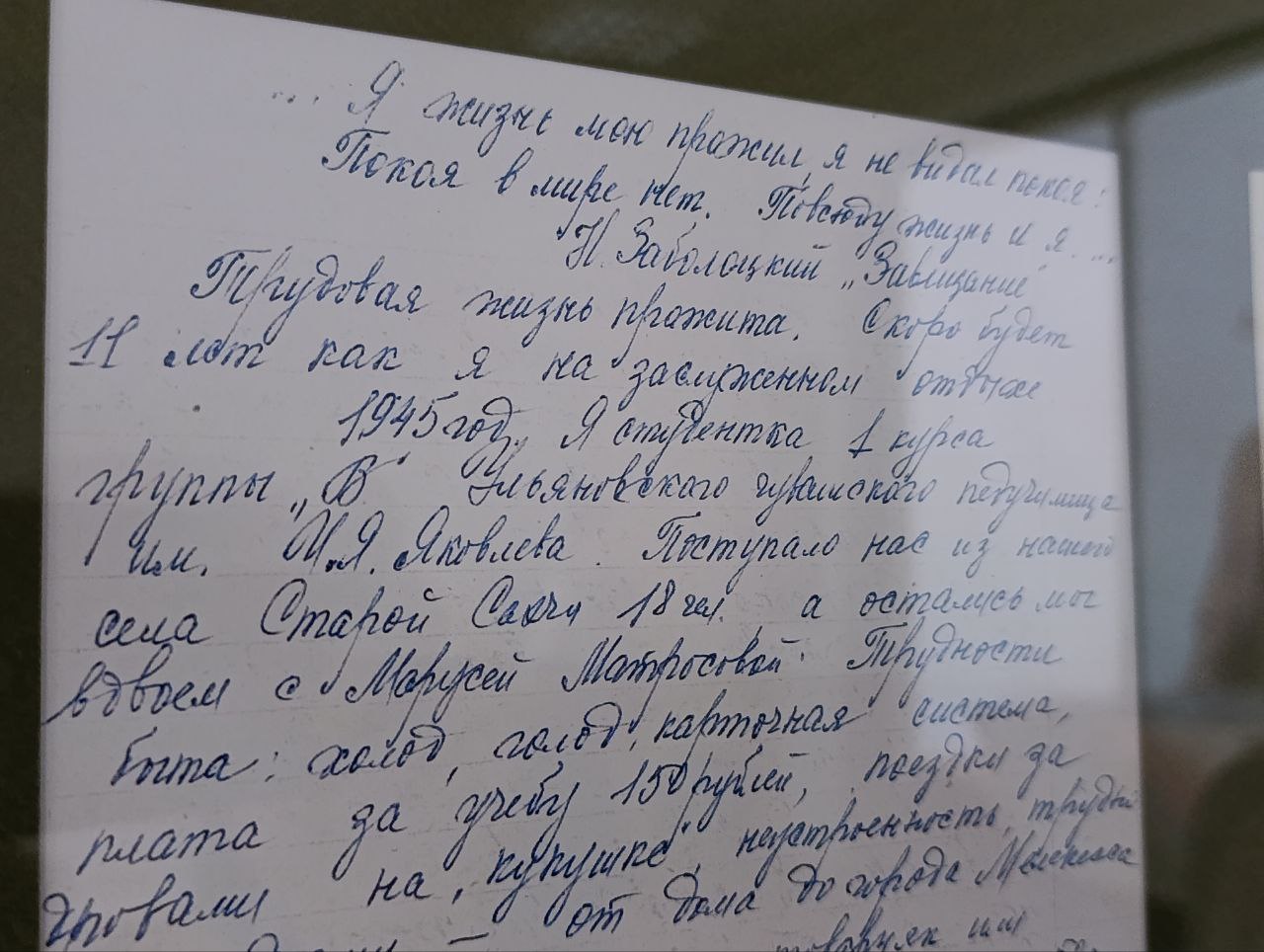 В жизни Марии Матросовой имела место трудно представимая сегодня ситуация, когда молодая девушка без одобрения семьи сбежала в Ульяновск из родного села, чтобы получить профессию учителя. Она успешно заканчивает обучение, уходит на фронт, после победы возвращается на родину, работает педагогом. Ее внучка, продолжившая педагогическую династию, предоставила семейные фотографии и документы. Они впервые представлены на выставке и после ее окончания вернутся в семейный архив.