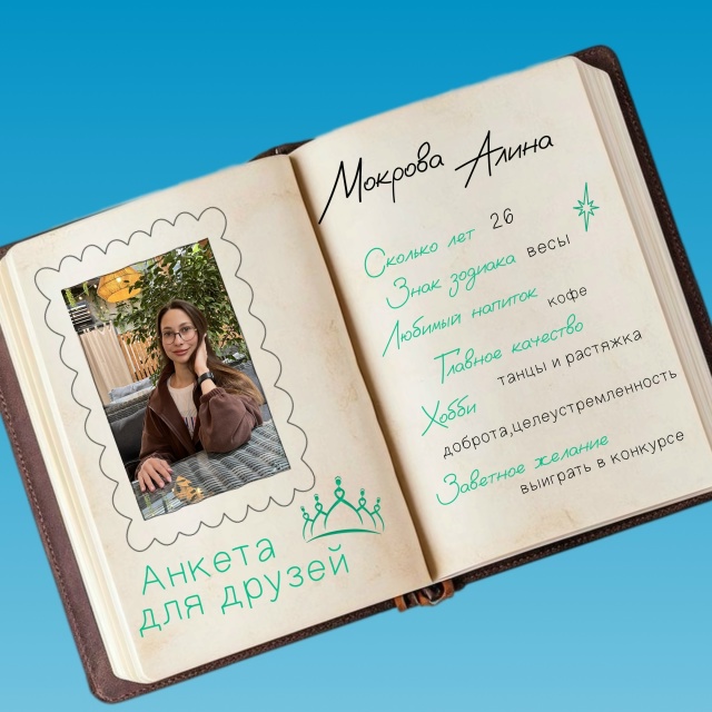 26 лет. Увлекается танцами и растяжкой. Любит кофе и мечтает выиграть в конкурсе. Считает, что главное — доброта и целеустремленность.
