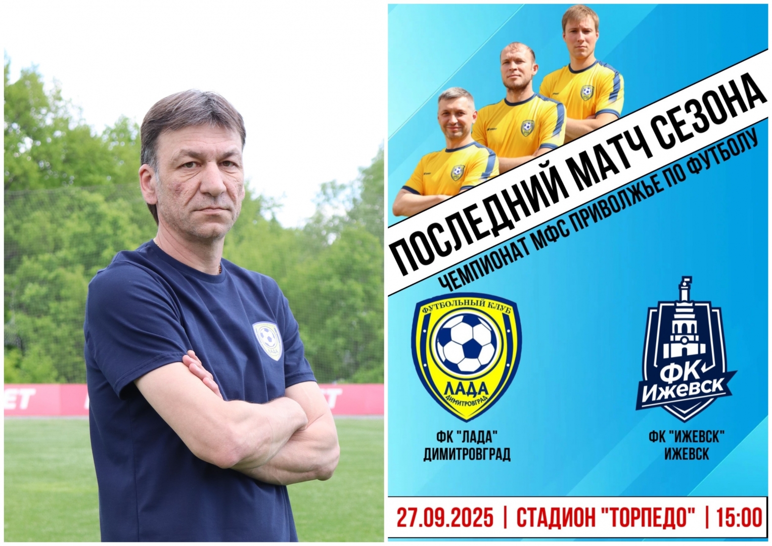Поединок против футбольного клуба «Ижевск» пройдет в ближайшую субботу на стадионе «Торпедо» в Димитровграде. Начало в 15 часов. Анонсируя матч, в стане димитровградской «Лады» его назвали последним в сезоне. Однако по календарю команде необходимо будет сыграть еще один раз на выезде против «Дорожника» из Каменки. Не исключено, что из-за отсутствия финансирования футболисты поедут в Пензенскую область за свой счет, предположил капитан команды опытный Марат Сафин.