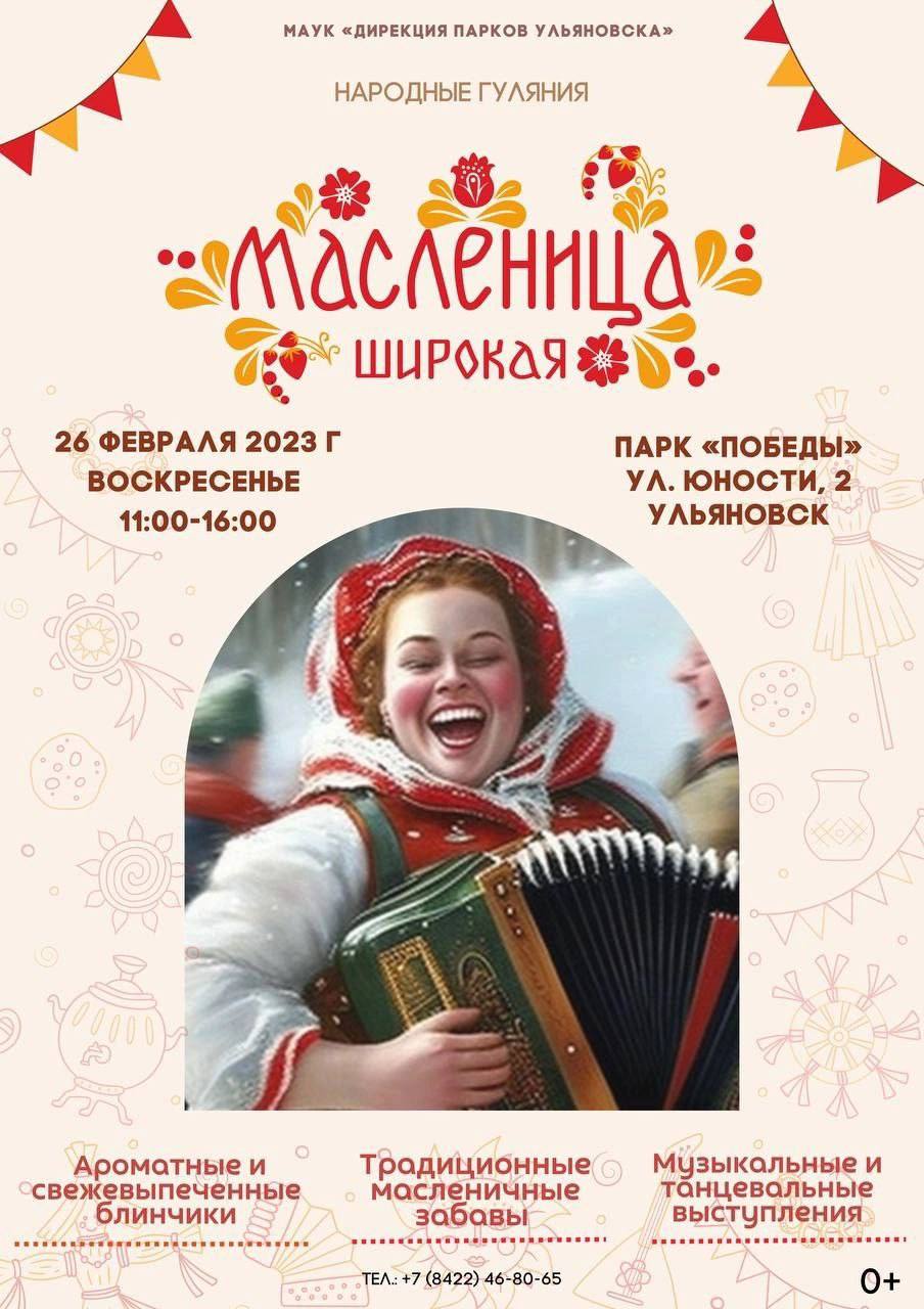 Вас ждет: масленичные игры и забавы, призы, танцевальные интерактивы, молодецкие забавы и состязания, выступление баяниста-виртуоза Михаила Жукова и ростовые куклы, старинная телега и яркая фотозона для необычных фотографий, фуд-корт с горячими блинами и чаем, ярмарка изделий ручной работы местных мастеров.