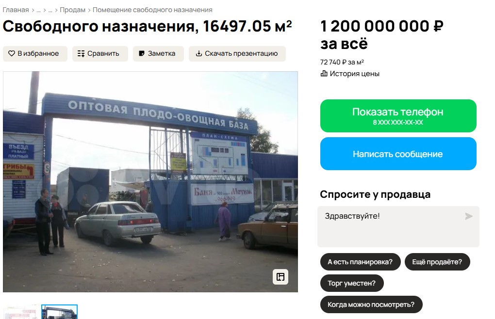 Объявление появилось на платформе «Авито» еще в декабре 2020 года, собственник — ульяновский бизнесмен Сергей Герасимов. Он пожелал расстаться с объектом общей площадью 16 011 кв.м. на земельном участке в 48 060 кв.м на улице Урицкого, запросив за него ₽1,2 млрд.