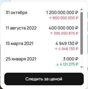Впервые объявление опубликовали пять лет назад и тогда цена была скромной — ₽4,1 млн, позже поднялась еще на 300тыс., в 2022 году выросла до ₽400 млн, а еще через пару лет взлетела в три раза — до ₽1,2 млрд.