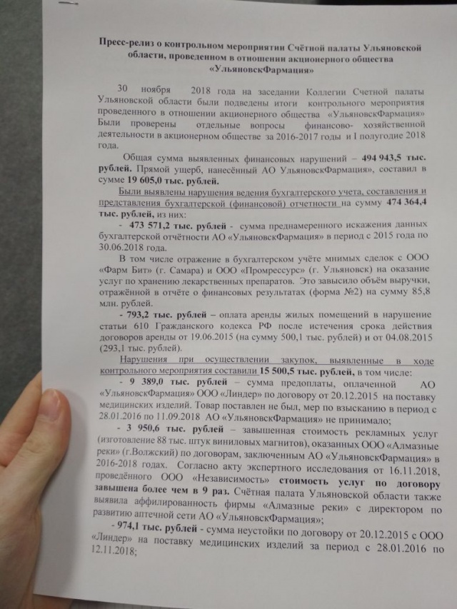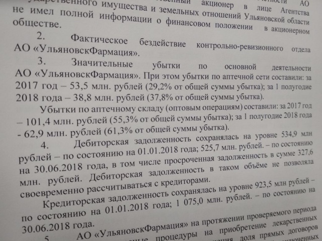 АО "УльяновскФармация" превратилось в "черную дыру" для бюджета Ульяновской области, констатировали аудиторы Счетной палаты региона. Общий объем финансовых нарушений общества приближается к сумме в полмиллиарда рублей. Тогда как глаза чиновников на ситуацию открылись только после того, как разразился скандал федерального уровня, увенчавшийся целой чередой уголовных дел и посадок.