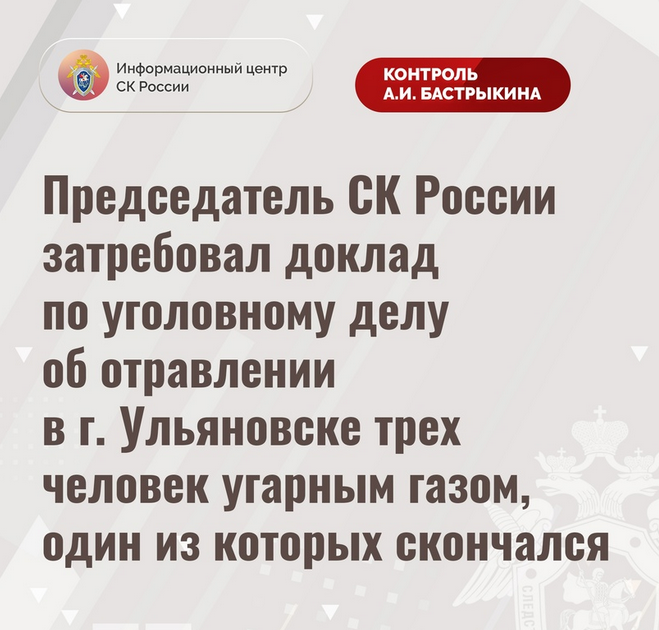 Председатель Следственного комитета России Александр Бастрыкин затребовал доклад по уголовному делу об отравлении в Ульяновске трех человек угарным газом, один из которых скончался, сообщает Информационный центр СКР.