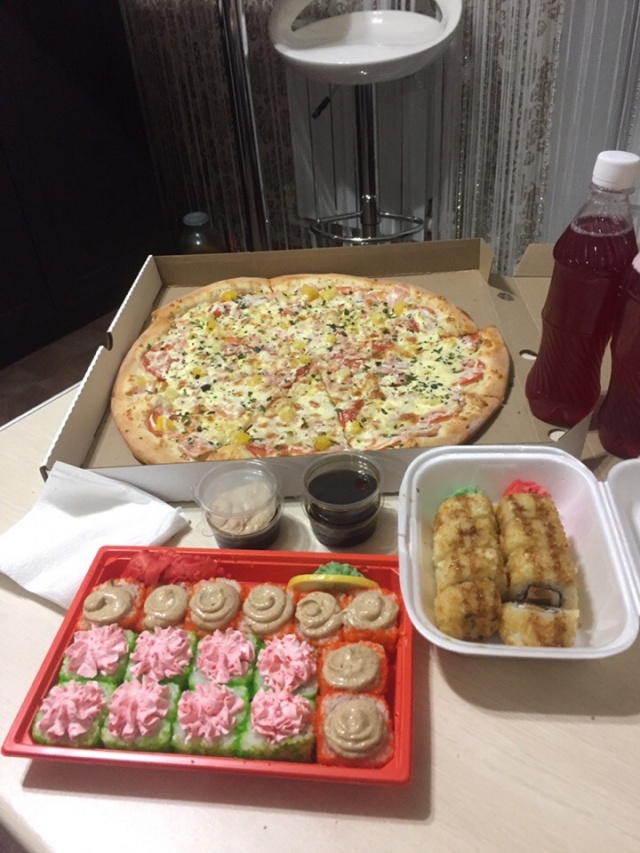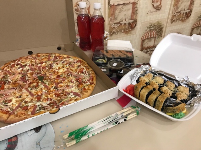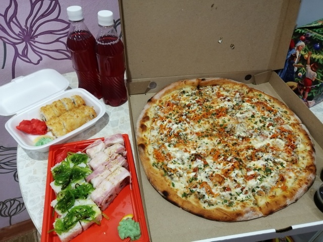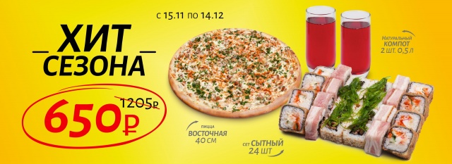 Каждый месяц обновляется сезонное предложение, рассчитанное на 3-4 человека. Хит сезона за 650 руб.: большая пицца 40 см, сет из фирменных, темпурных и запечённых роллов на 24 кусочка и натуральный компот собственного приготовления, очень вкусный!