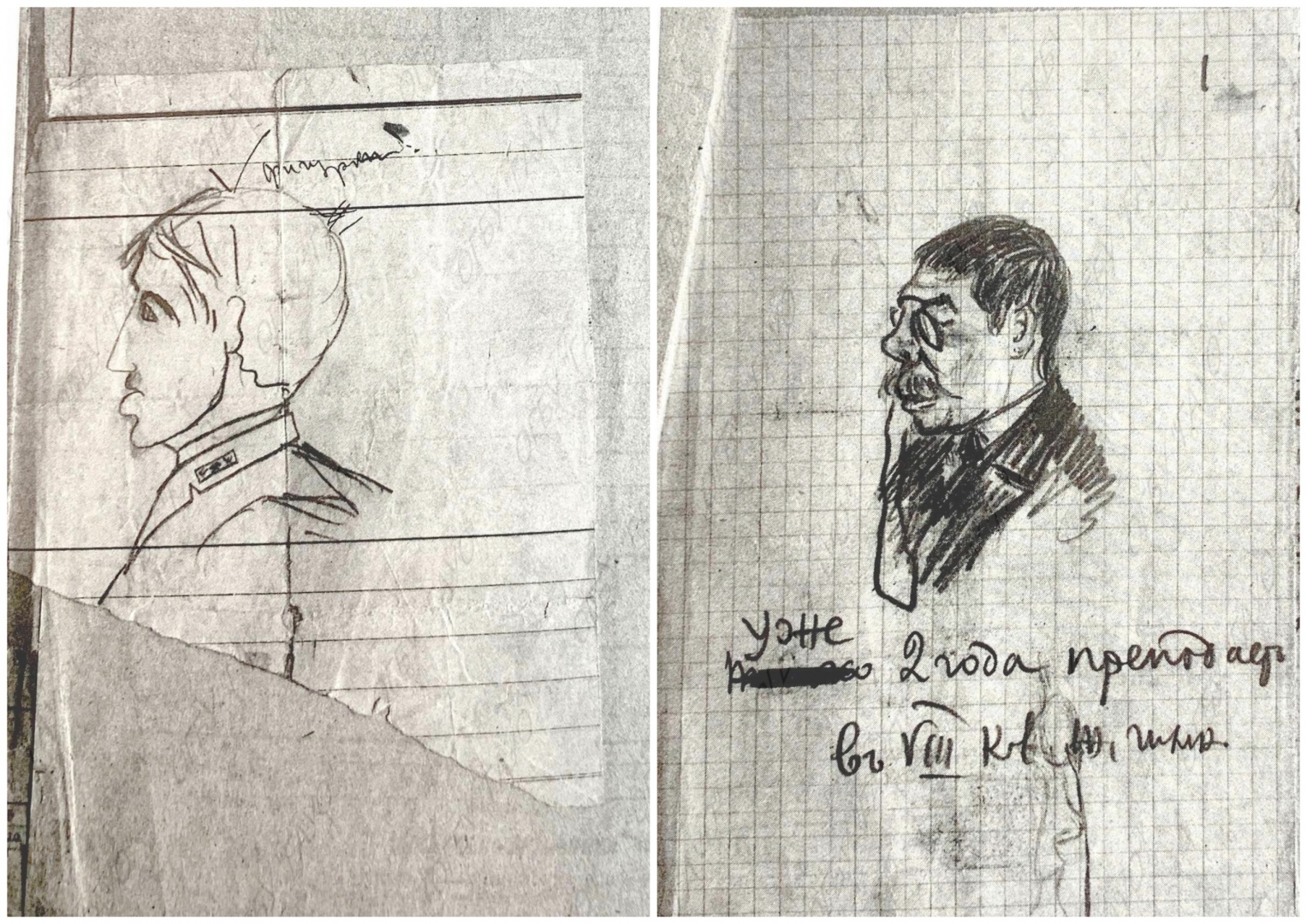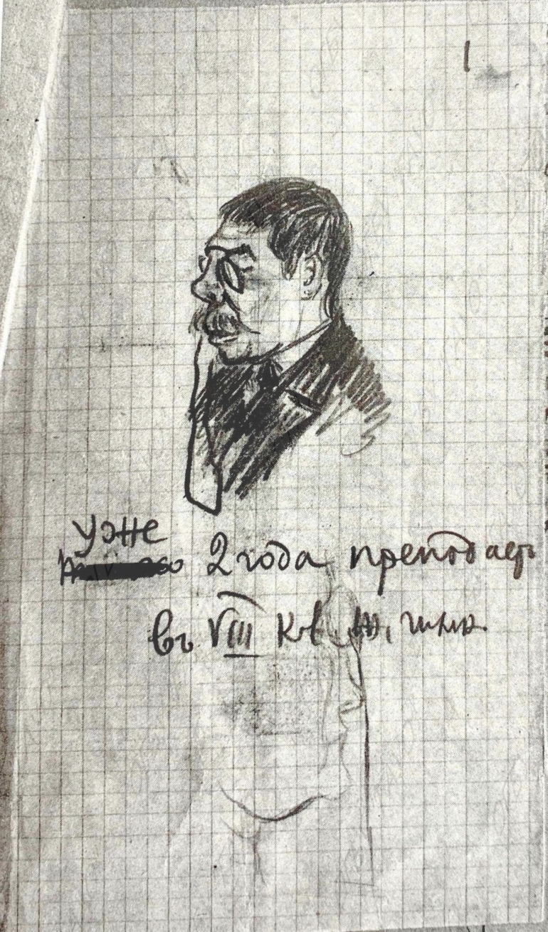 Наброски сделаны на небольших листочках и, скорее всего, были отобраны Степановым у шалунов-рисовальщиков. На клочке бумаги – профиль какого-то молодого педагога, а на обороте надпись: «Передавай дальше». Видно, нарисовали во время урока и пустили по рядам. На другом рисунке – некий несколько осоловелый усатый тип на пенсне. Автор шаржа сделал приписку: «Только 2 года преподает в VIII кл/ассе/ж/енской/гимн/азии/». Потом кто-то исправил «только» на «уже». Ничего удивительного нет и в том, что педагог работал сразу и в мужской, и в женской гимназиях – часто практиковалось преподавание в нескольких учебных заведениях. Например, так поступал и старший брат писателя И.А. Гончарова Николай. В середине XIX века этот талантливый учитель русского языка и литературы иногда с таким увлечением рассказывал о правилах грамматики, что забыл, где находится. И одергивал гимназистов-мальчишек грозным окликом:- Тише, барышни, тише! – вообразив, по рассеянности, что ведет урок в женском Елизаветинском училище. Один из учеников Н.А. Гончарова, зоолог и писатель М.Н. Богданов отзывался о нем как о «замечательном чудаке» и «общем любимце».