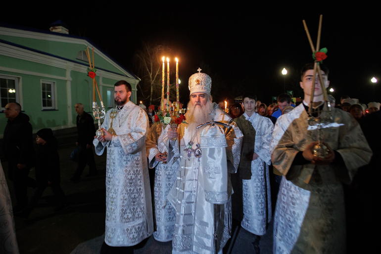 Пасхальное богослужение началось с крестного хода вокруг храма, который возглавил Митрополит Лонгин.