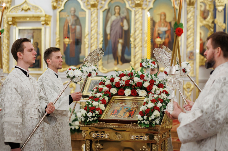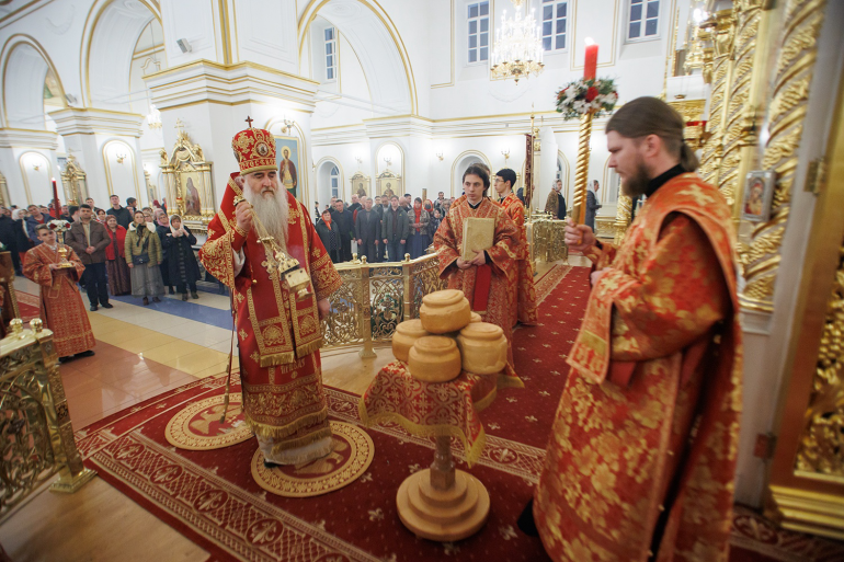 Его Высокопреосвященству сослужили иеромонах Иларион (Хроль), иерей Владимир Ващенко, иерей Димитрий Трофимов, иерей Владимир Коблов, диакон Иоанн Косяков, диакон Александр Шевченко, диакон Георгий Джмиль, диакон Сергий Чернов.