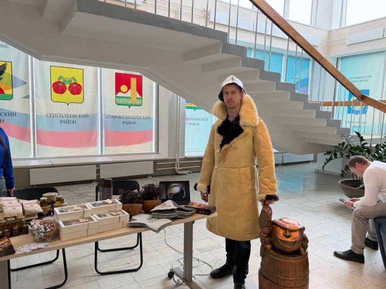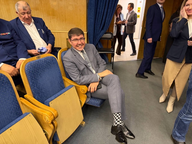 Глава регионального центра «Мой бизнес» Руслан Гайнетдинов в модных носках. Говорит, надел их ради Нашей Лены. Приятно. А шикарный костюм, говорит Гайнетдинов, от ульяновской фабрики «Бостон». Проверять лейбл не стали, поверили так.