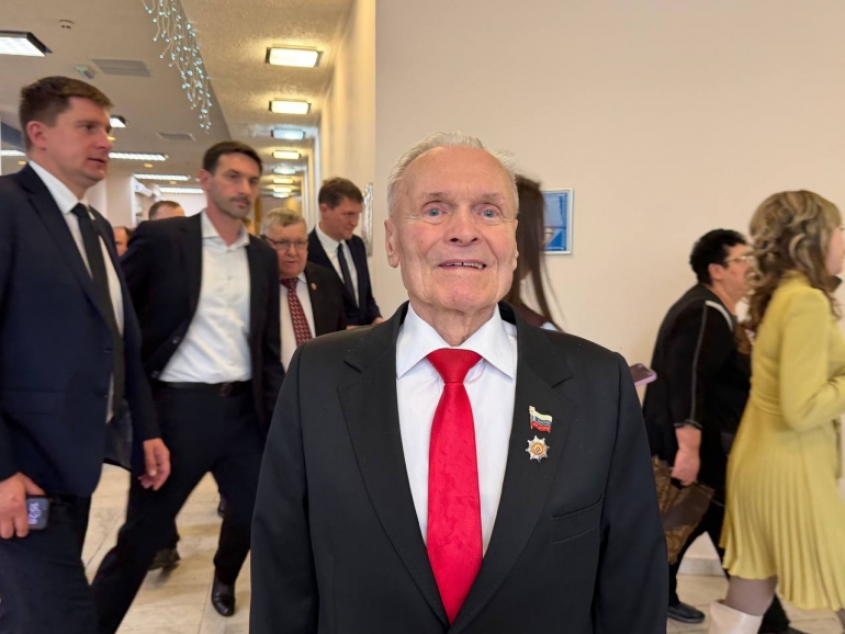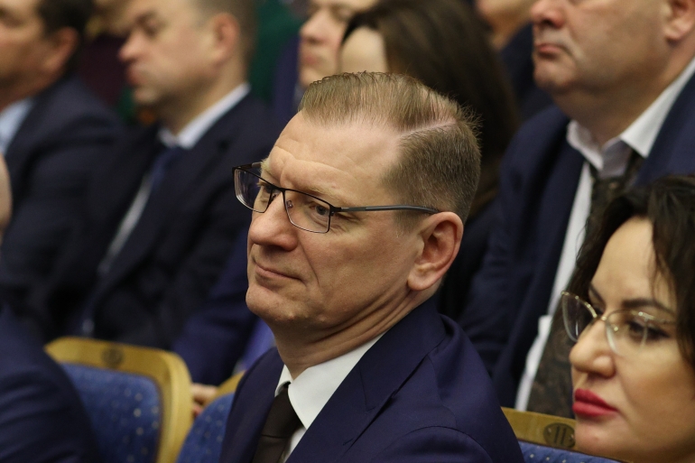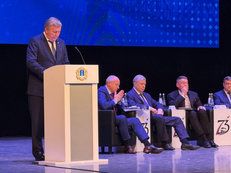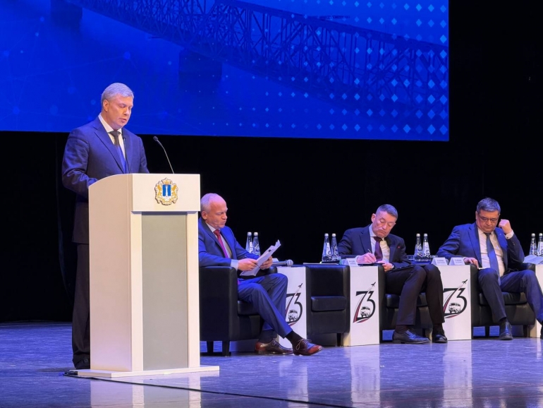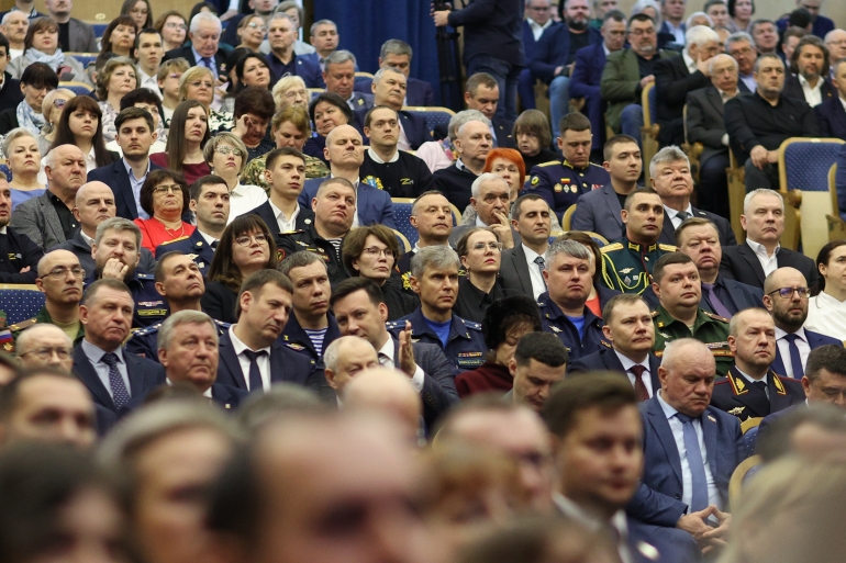 Начался отчет. На сцену вышел губернатор Алексей Русских. Вместе с ним на сцене — солидный президиум: гендиректор Авиационного комплекса имени С.В. Ильюшина Даниил Бренерман, первый вице-президент «ОПОРЫ РОССИИ» Азат Газизов, гендиректор ФГБУ «НМИЦ радиологии» Минздрава РФ Андрей Каприн, депутат Госдумы, президент благотворительного Фонда «Защита Детства» Наталья Карпович, спортивный комментатор, телеведущий, член Академии российского телевидения Георгий Черданцев, замгенерального директора Центра стратегических разработок Татьяна Караваева.