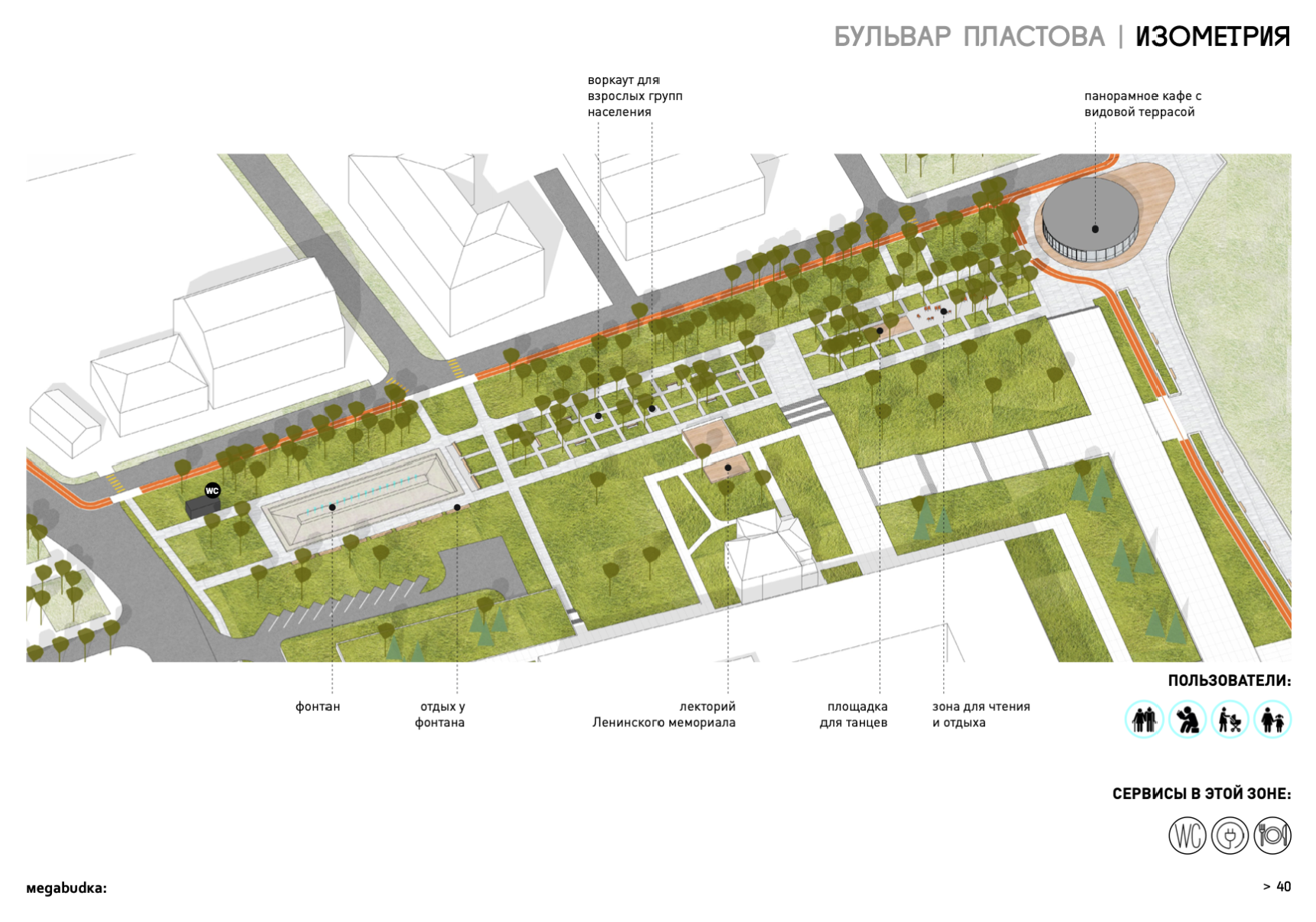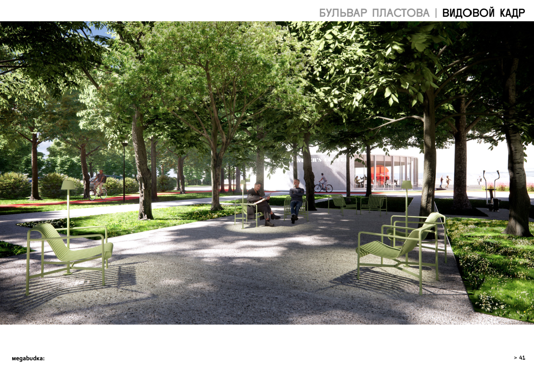 На бульваре Пластова добавили парковочные места, проложена живописная велодорожка, убран съезд, пешеходную зону больше не прерывает автомобильное движение. Расставлены обзорные скамейки, панорамное кафе, зона чтения, лежаки на склоне. Сделан сквер, у Ленинского мемориала - лекторий, зона отдыха у фонтана.