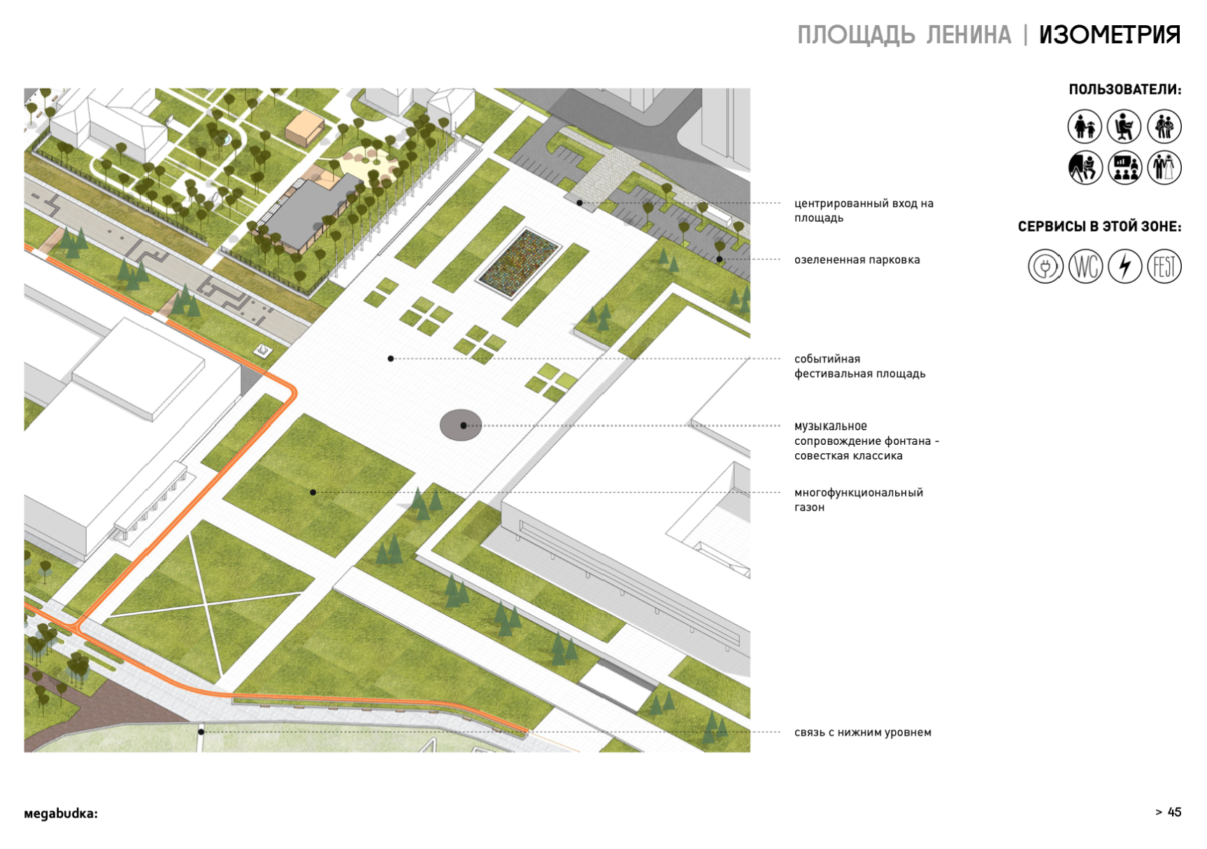 На площади Ленина будет спуск на нижний ярус, прогулочная набережная и многофункциональный газон. Остается площадь для проведения мероприятий.