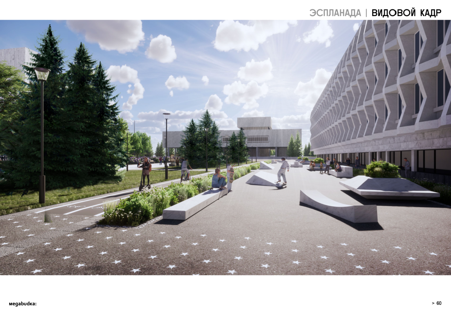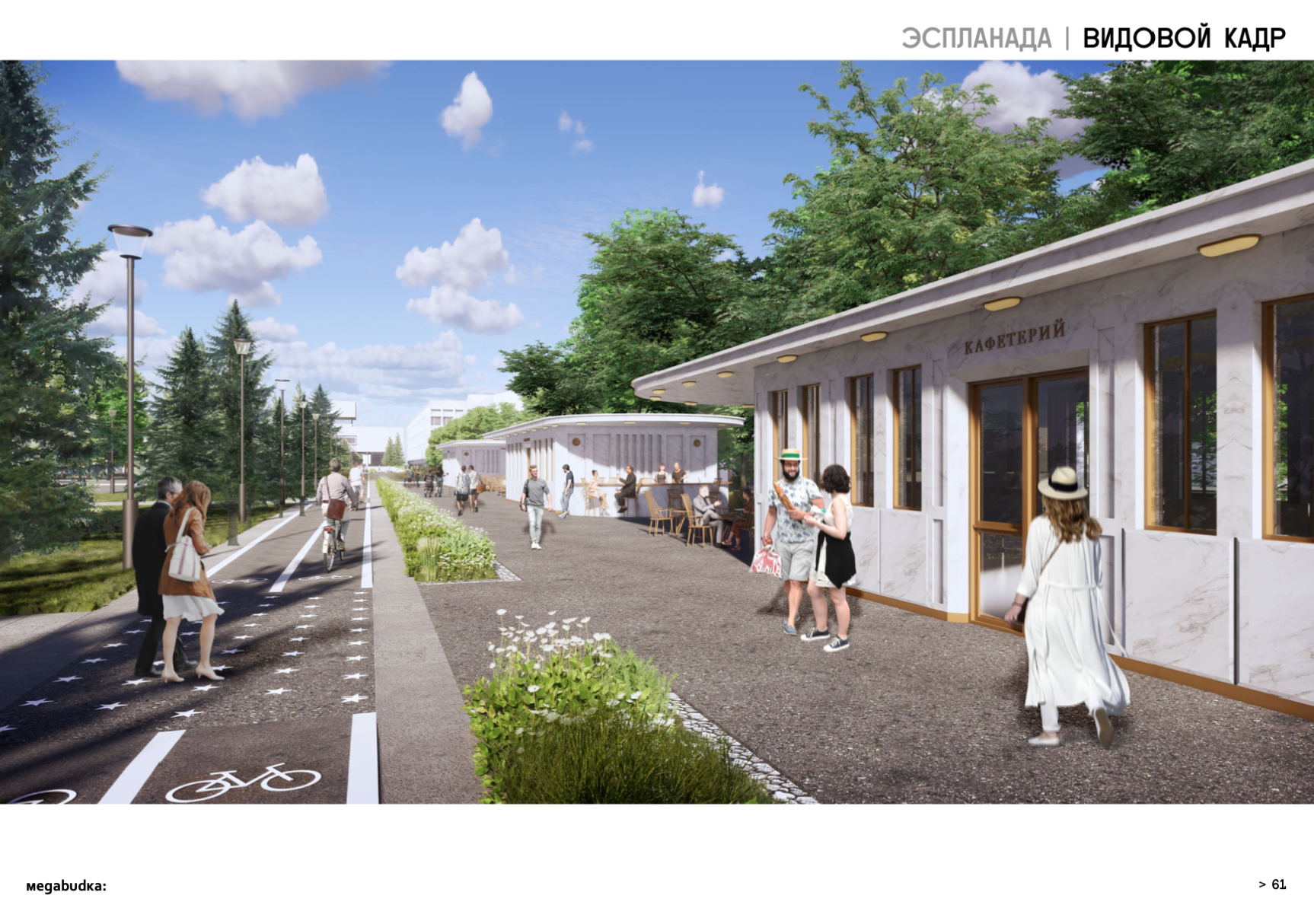 На эспланаде сделают скейт-зону, розарий, сквер средневековой культуры, детскую площадку и оранжерею. Также по периметру будут торговые павильоны, появится семейное кафе.