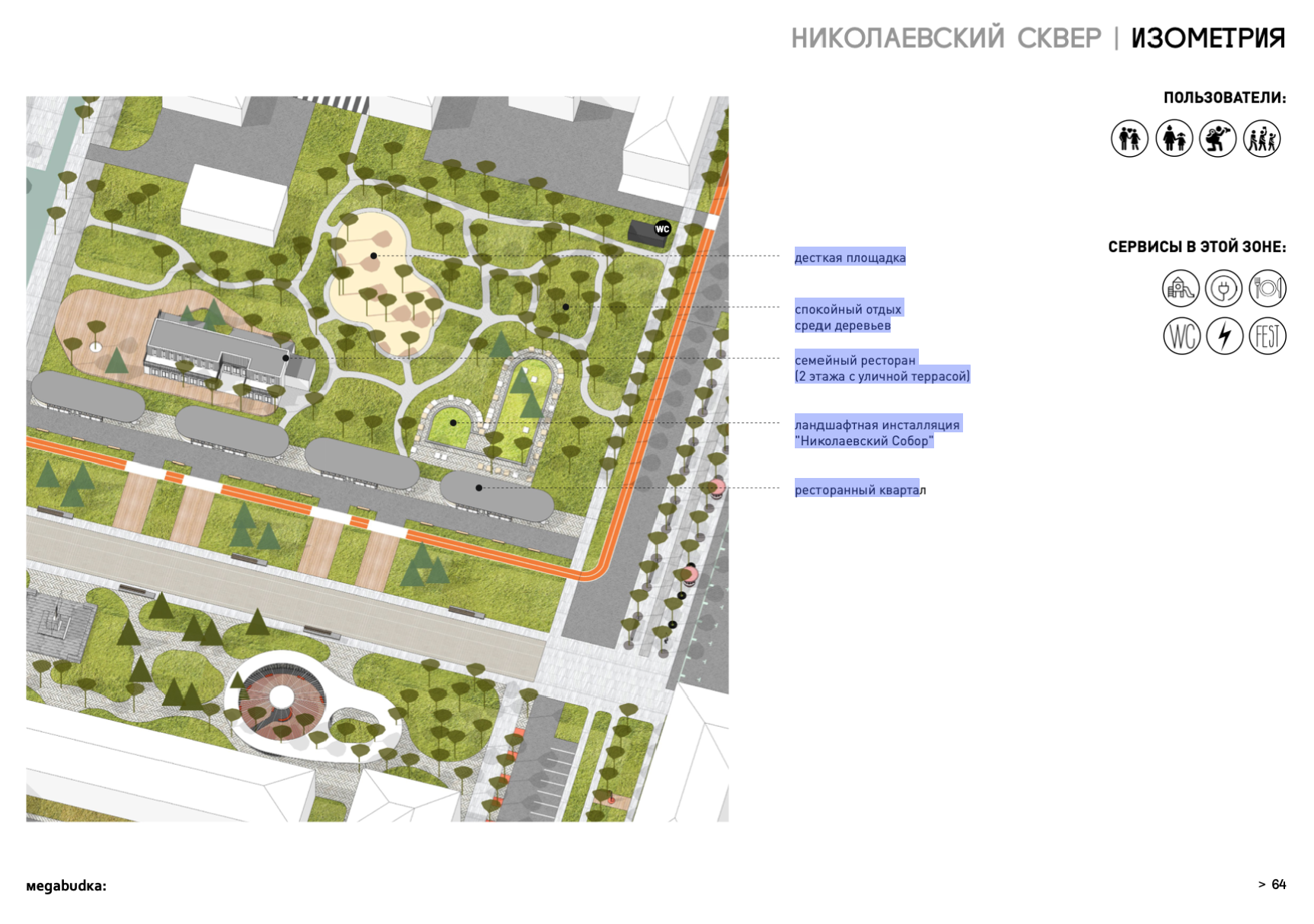 В Николаевском сквере обустроят детскую площадку, зону для спокойного отдыха среди деревьев, двухэтажный семейный ресторан с уличной террасой, ландшафтную инсталляцию Николаевского собора, который там находился и ресторанный квартал.