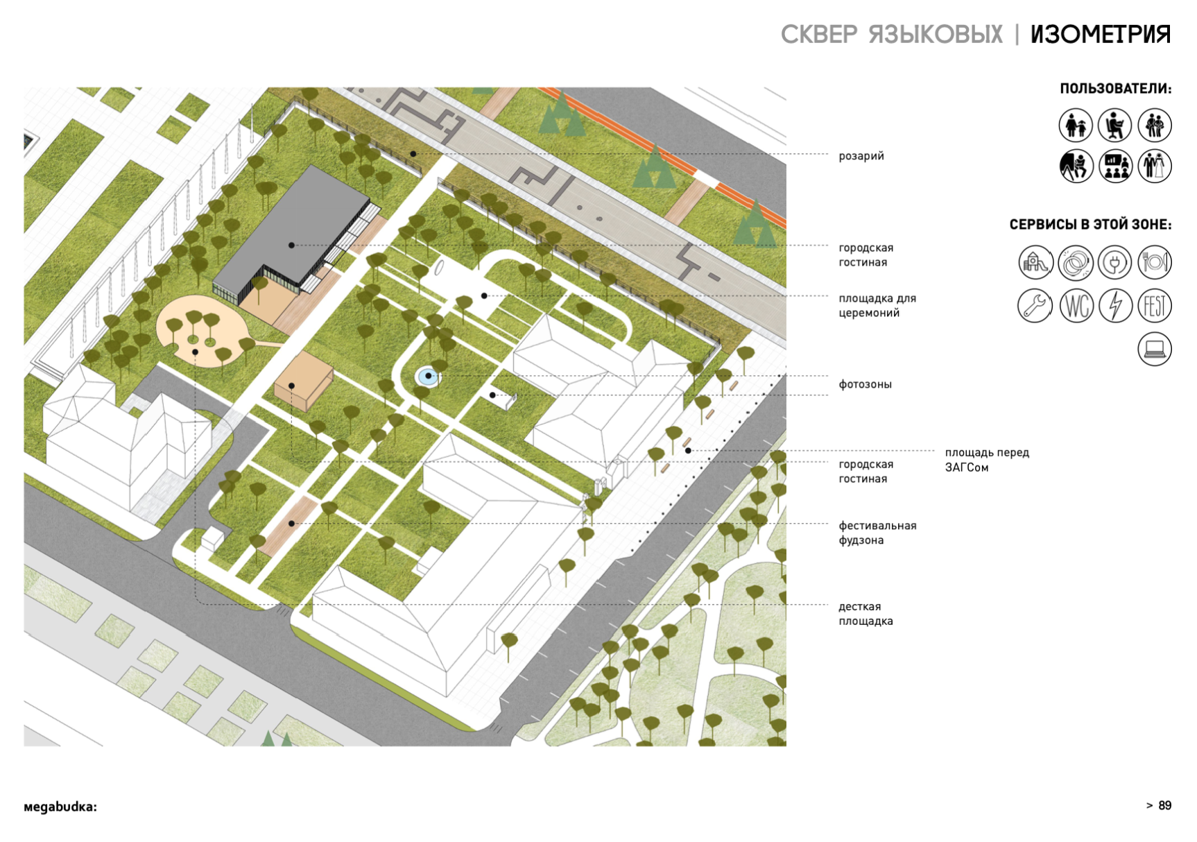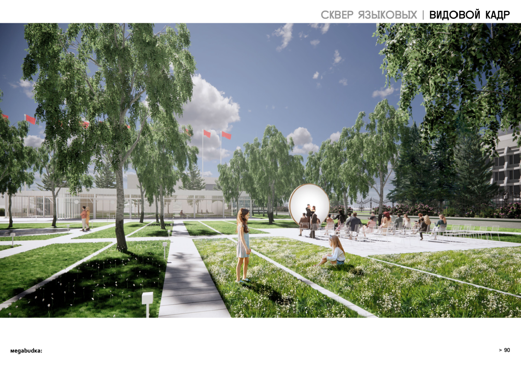 В сквере Языковых разместят розарий, детскую площадку, церемониальную площадку, зону для фуршета, фотозону с прудом, сцену, зону для фудкорта на период проведения мероприятий.