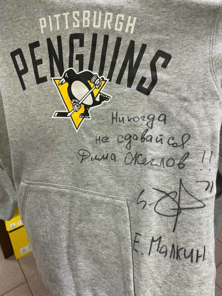На матче в «Лидере» мальчика увидели игроки одной из команд Ночной хоккейной лиги, выпускники бизнес-школы «Сколково». Его история задела их сердца, и они решили сделать ему подарок. Хоккеистам удалось подписать толстовку у центрального нападающего клуба НХЛ «Питтсбург Пингвинз» и сборной России Евгения Малкина. «Никогда не сдавайся, Дима Жеглов», — написал известный спортсмен и поставил свой автограф. Толстовку доставили в Москву, а уже оттуда — прямиком домой к Диме.